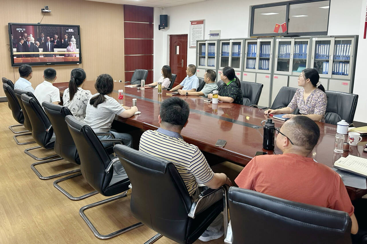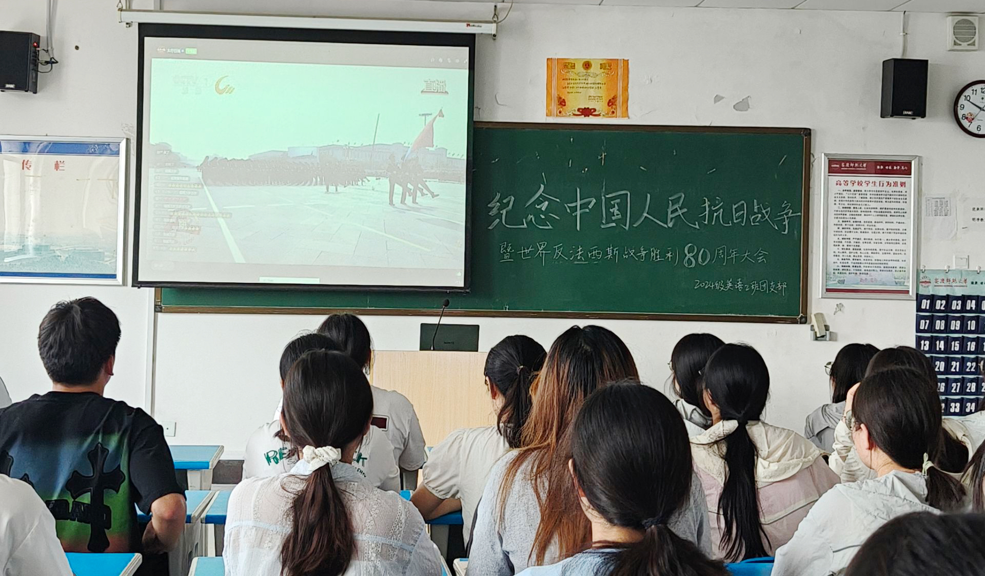 党政领导、教师代表齐聚一堂,各班级团支部在责任教室集中观看纪念中国人民抗日战争暨世界反法西斯战争胜利80周年大会直播。屏幕上,天安门广场旌旗猎猎,长安街上受阅部队整齐列阵,新型武器装备首次亮相,展现了我国国防科技的飞速发展和国家实力的日益增强。教师们神情庄重,学生们全神贯注,共同见证这一庄严时刻。直播结束后,师生们纷纷表示,阅兵盛典令人震撼,民族自豪感油然而生。