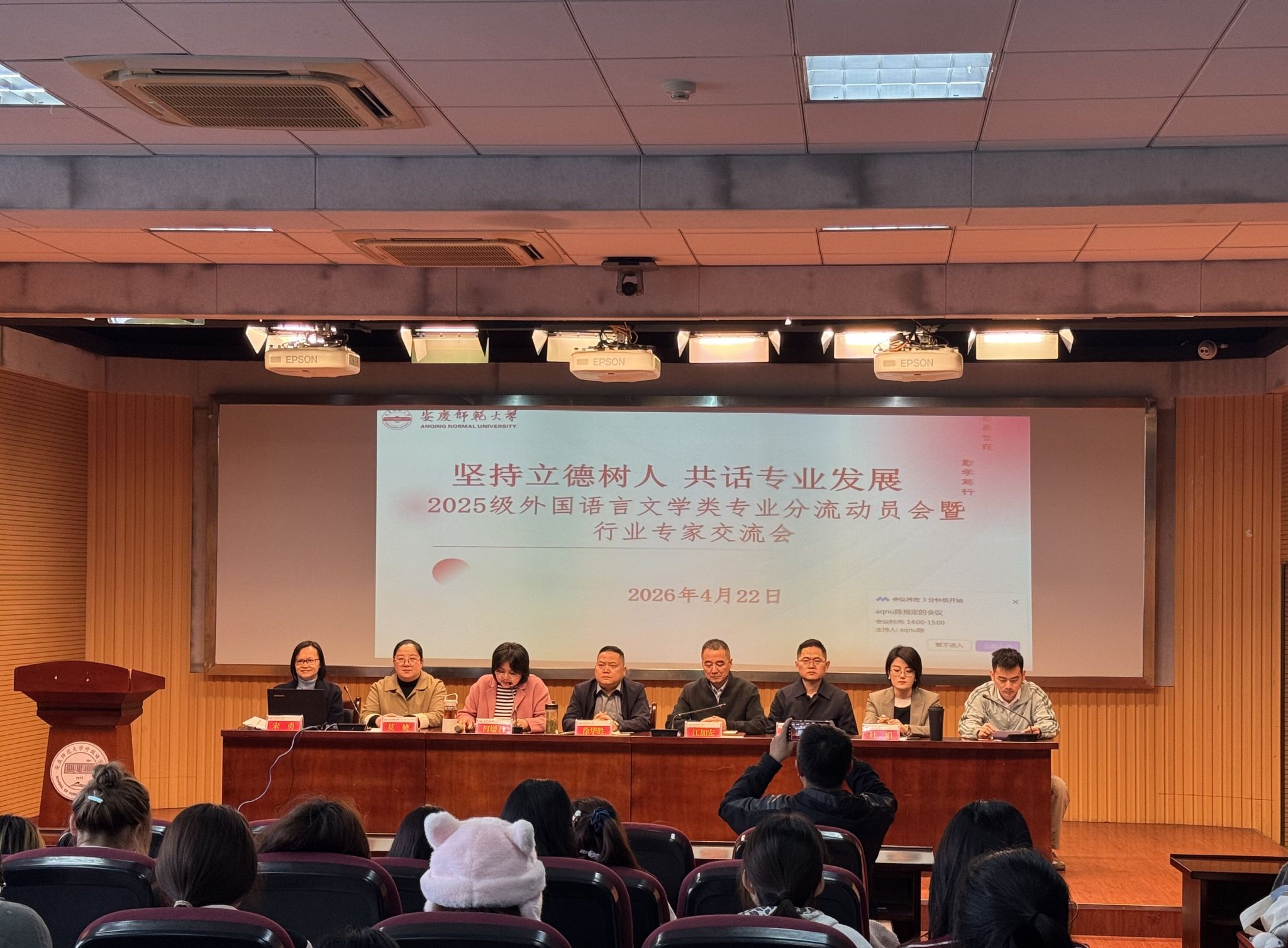 会议特别邀请行业专家开展专题宣讲,帮助同学们更清晰地了解英语、商务英语和翻译专业的发展前景。安庆二中政教处副主任莫姚老师从教育赋能、文化传播、师德修养等多元角度,系统阐释了师范英语专业的核心竞争力、人才培养目标及未来职业发展机遇,让同学们对师范方向的职业路径、岗位要求有了更为清晰、深刻的认知。会议以视频形式展现了2013届商务英语专业毕业生李文亚的个人成长纪实。作为现任合肥市美亚光电技术股份有限公司国贸部欧洲平台长,李文亚结合自身多年从业经历,生动讲述了商务英语在国际贸易、跨境电商、国际商务谈判等领域的实际应用场景,全面展现了商务英语专业的广阔发展前景与职业价值,其成长故事极具感染力与参考意义,为同学们提供了鲜活的实践借鉴。传神语联网网络科技股份有限公司项目总监靳伟通过在线讲座,以《破局AI浪潮、外语专业链接全球机遇》为题,聚焦翻译专业发展趋势,重点分析了AI技术对翻译行业的深刻影响。他指出,AI翻译工具能够有效提升翻译效率、优化工作质量,成为翻译从业者的重要辅助,但无法完全替代人工翻译所具备的专业性、逻辑性与情感温度。同时,他鼓励同学们扎实筑牢英汉语言基础,着力提升跨文化沟通、逻辑思辨与专业翻译能力,以核心素养应对行业变革,在翻译领域实现自身价值。