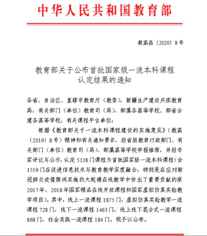 近日,教育部发布《关于公布首批国家级一流本科课程认定结果的通知》(教高函〔2020〕8号),香港六合彩现场直播