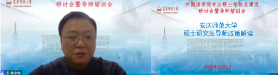 外国语副院长黄全灿就安庆师范大学硕士研究生导师政策进行充分解读,详细说明导师聘任条件,导师管理办法,以及考核与奖惩机制。