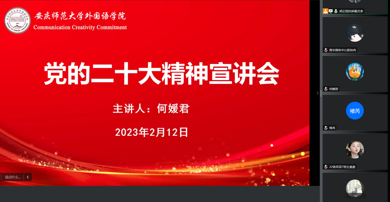 党委副书记何媛君作题为《学习宣传贯彻党的二十大精神,推动基层党团组织建设》线上宣讲报告会,会议旨在深入学习宣传贯彻党的二十大精神,坚决以中国化时代化的马克思主义武装头脑,法语、日语教研室党支部,翻译教研室党支部,青马班全体成员及第二期入团积极分子近100人参会。