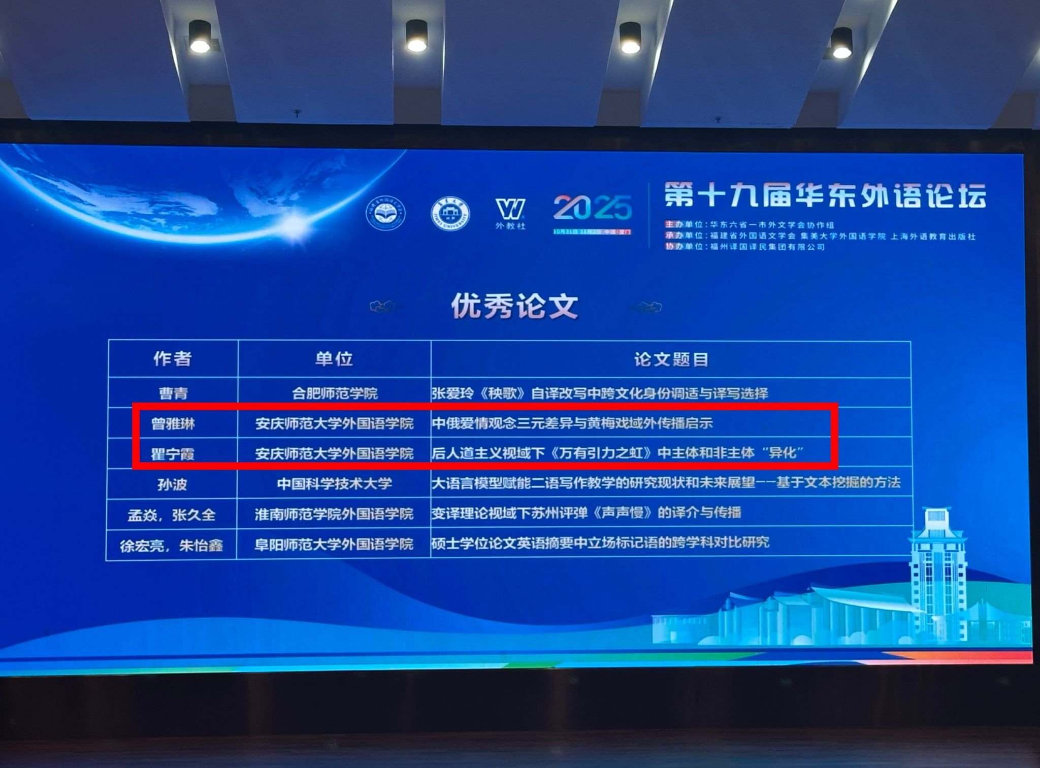 4名参会教师紧扣国别与区域研究、外国文学、外语教育学等方向,分别在各平行分论坛作专题汇报,并与现场专家学者围绕研究热点、学术难点展开深度研讨。其中2名参会老师的投稿论文获评本届论坛“优秀论文”,并入选《华东外语论坛》(第17辑)。